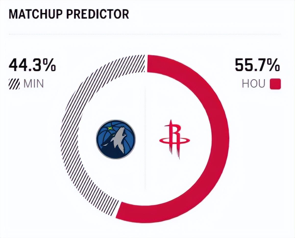 这是两队本赛季的首次交锋,近5次交手中,火箭3胜2负稍占优势。赛前,美媒ESPN对本场比赛进行了预测,火箭胜率高达55.7%,森林狼胜率只有44.3%,稍占劣势。